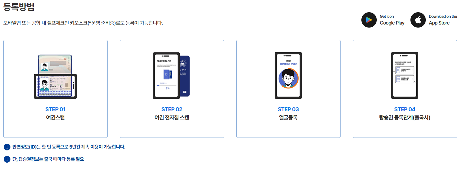 스마트패스는 셀프 키오스크(터미널 1과 2에 위치) 또는 공식 인천공항 스마트패스 앱을 통해 등록할 수 있습니다. 등록 절차는 여권 스캔, 얼굴 정보 캡처, 탑승권 연동으로 이루어집니다. 얼굴 정보는 5년 동안 유효하지만, 탑승권은 매번 새롭게 등록해야 합니다.