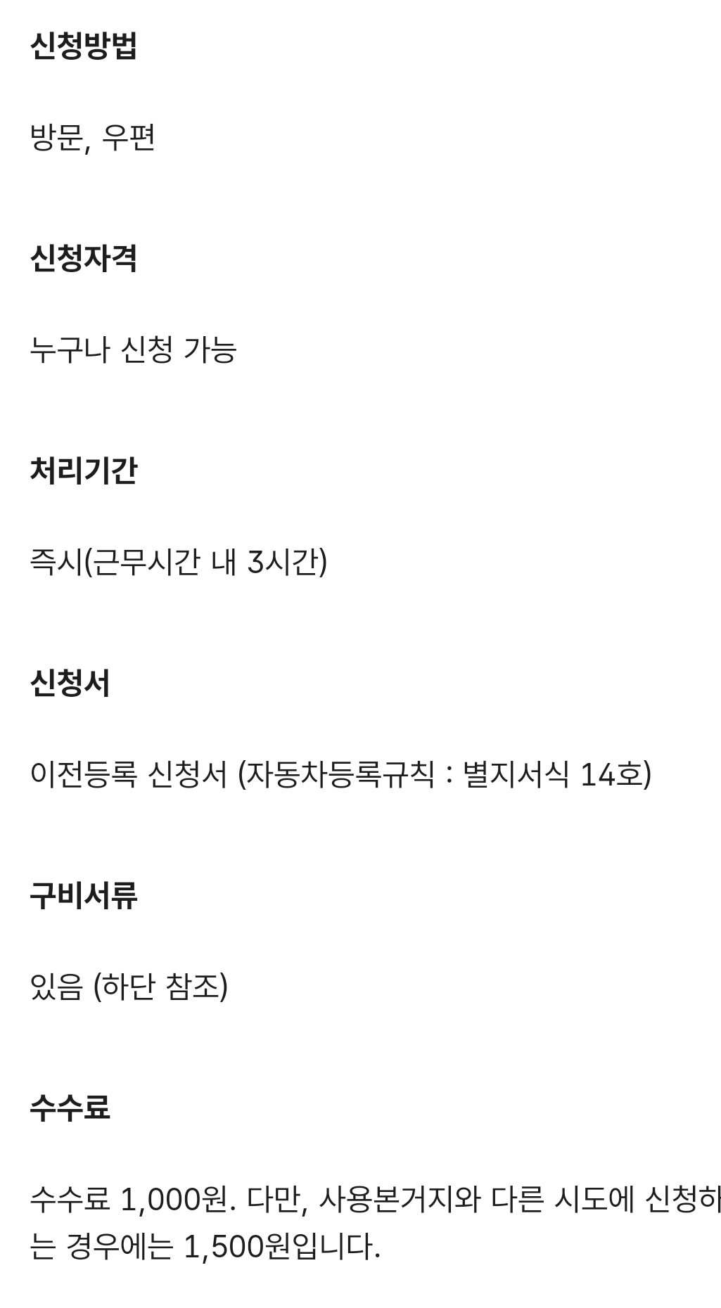 - 방문 신청 : 가까운 자동차 등록사업소를 방문하여 신청할 수 있습니다. 이 경우, 필요한 서류를 모두 지참해야 하며, 현장에서 작성해야 할 서류도 있습니다.