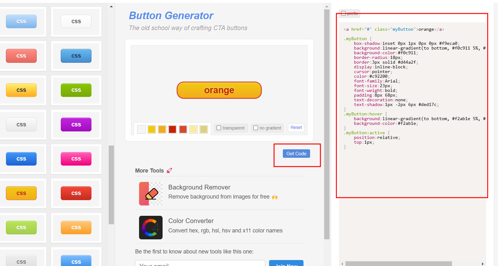 버튼 고르는데는 1분 정도 걸렸습니다. 만들고 나면 'Get Code' 버튼을 눌러서 오른쪽에 html 과 css 코드를 얻을 수 있습니다. 보니까 맨 윗줄은 html 코드이고 그 밑부분은 css 코드더라구요. 개발자가 아니라 자세히 설명하기는 힘들지만 해본 결과, 밑부분에 있는 css 코드가 필요했습니다. 우선 전체를 다 복사해주고 티스토리로 넘어옵니다.