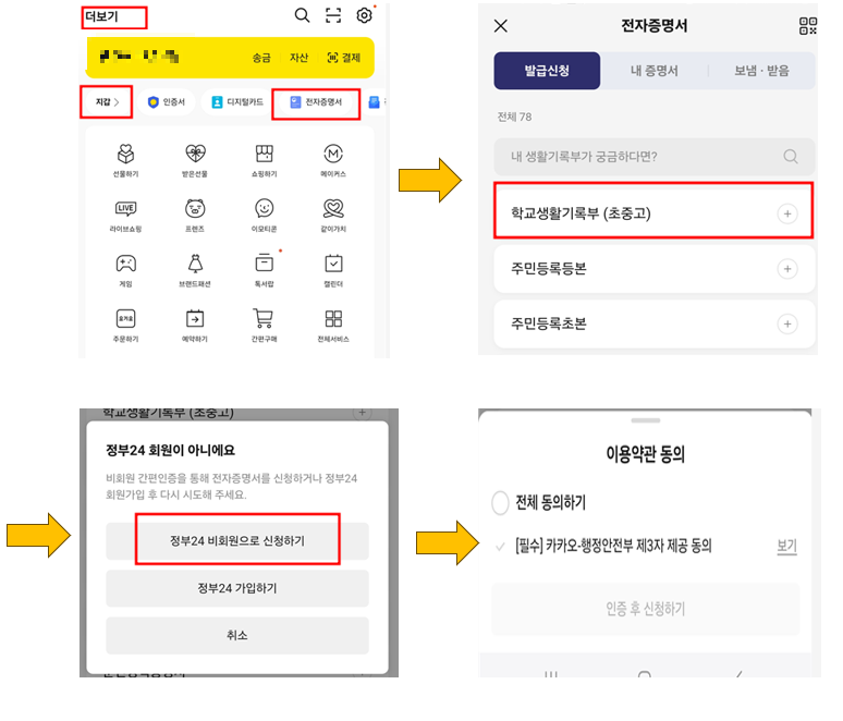 - 발급 위치 : 카카오톡 - 더보기 - 지갑 - 전자증명서 로 이동합니다.