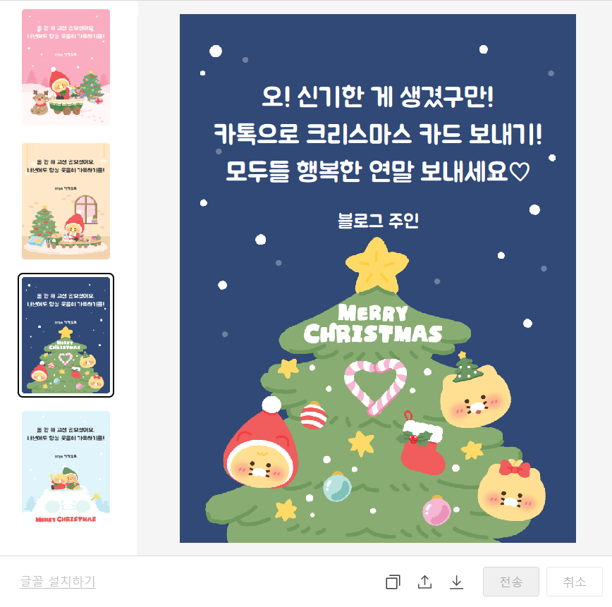 2024년의 크리스마스가 다가오고 있습니다. 크리스마스가 개인적으로는 큰 의미가 없지만 모두에게 즐거운 날이고 기쁜 날이죠. 물론 휴일이기도 하구요! 즐거운 날 친구나 지인에게 크리스마스 카드 하나 쯤 보내면 좋지 않을까요? 저도 방금 카톡을 하다가 카드 만들기가 있어서 한 번 만들어봤는데요!