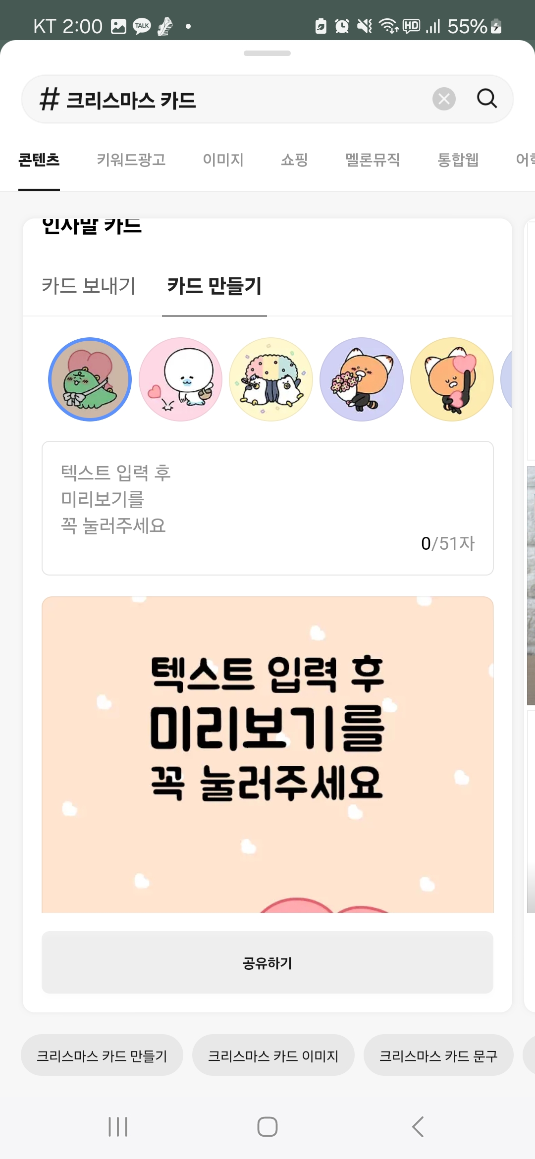 #크리스마스카드 를 검색해서 들어가는 방법인데요, 결론은 별로입니다! 카드는 PC로 만드는게 좋아요. 왜냐면 검색을 했을 때 일반 모바일페이지에서 만드는 화면이 나오게 됩니다. 어떠신가요? 멘트도 넣을 수가 없어요. 별로인 것 같지 않나요? 그 옆에 카드만들기가 있어서 그것도 해봤습니다!